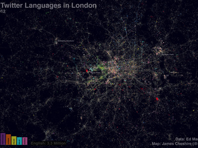 Using an algorithm adapted from web browser Google Chrome, engineering doctorate candidate Ed Manley and spatial analysis lecturer James Cheshire, both from University College London, were able to detect the language of tweets sent from the London area over the summer. Of 3.3 million tweets, 92.5 per cent are, not surprisingly, in English. The biggest tweeting tongues after that are Spanish (grey), French (red), Turkish (dark blue), Arabic (green), Portuguese (purple), German (orange), Italian (yellow), Malay (turquoise) and Russian (pink).