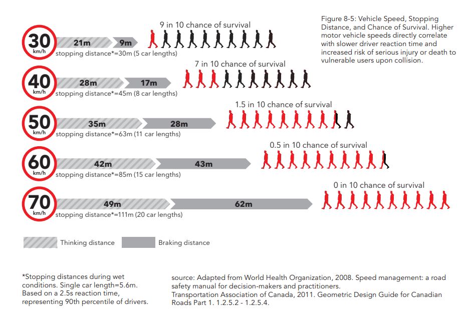 Infographic : Vehicle Speed, Stopping Distance, And Chance Of Survival (c/o Toronto Complete Streets Guidelines)