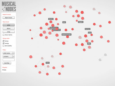 | Project Description: MusicalNodes is a visualization system for digital music collections. Artists, albums, songs and genres are represented as nodes in a network, where musically similar items are connected with each other. A force based graph determines the positions of the nodes, based on data like song tempo, genre and similar artists. It provides a good overview of your music at a glance and offers new insights into your collection. |