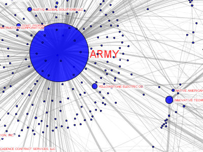 A network of 3000 contracts among 2700 primary funding offices, contracting corporations and subcontractors reported as receiving funds from the US Department of Defense. Nodes indicate organizations, The size of the nodes is relative to the current sum of payments it has made. Grey lines indicate payments, with widths proportional to the aggregate amounts.