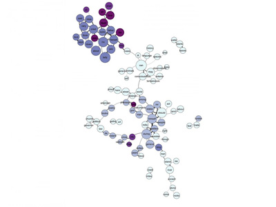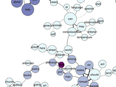 | Project Description: Ted Underwood, working with Michael Simeone, developed strategies for visualizing topic models. Most methods for computing topic models have ontologically fuzzy boundaries, and so focusing on a single topic is risky. Underwood produced a correlation matrix of the topics and connected topics in this graph that are strongly correlated with each other. Size is logarithmically proportional to to the number of tokens. Even this kind of network model, however, suggests visual structure that isn’t necessarily there. Underwood goes further to suggest the use of PCA to visualize the relationship between topics. |