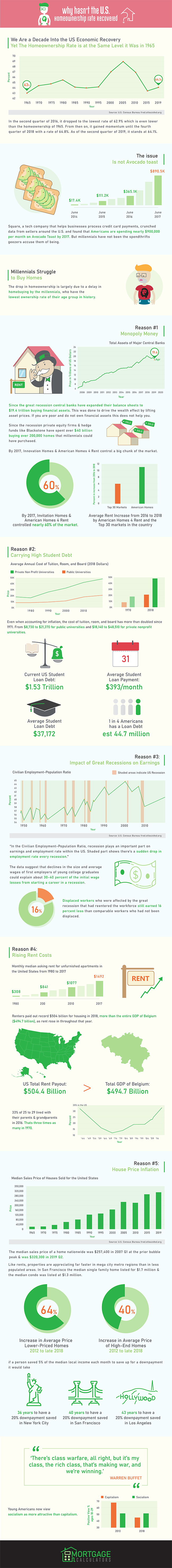 Why hasn’t the US homeownership rate recovered? infographic from Mortgage Calculators covers a variety of reasons, backed by data, that review what is going on with the current state of the US housing market.