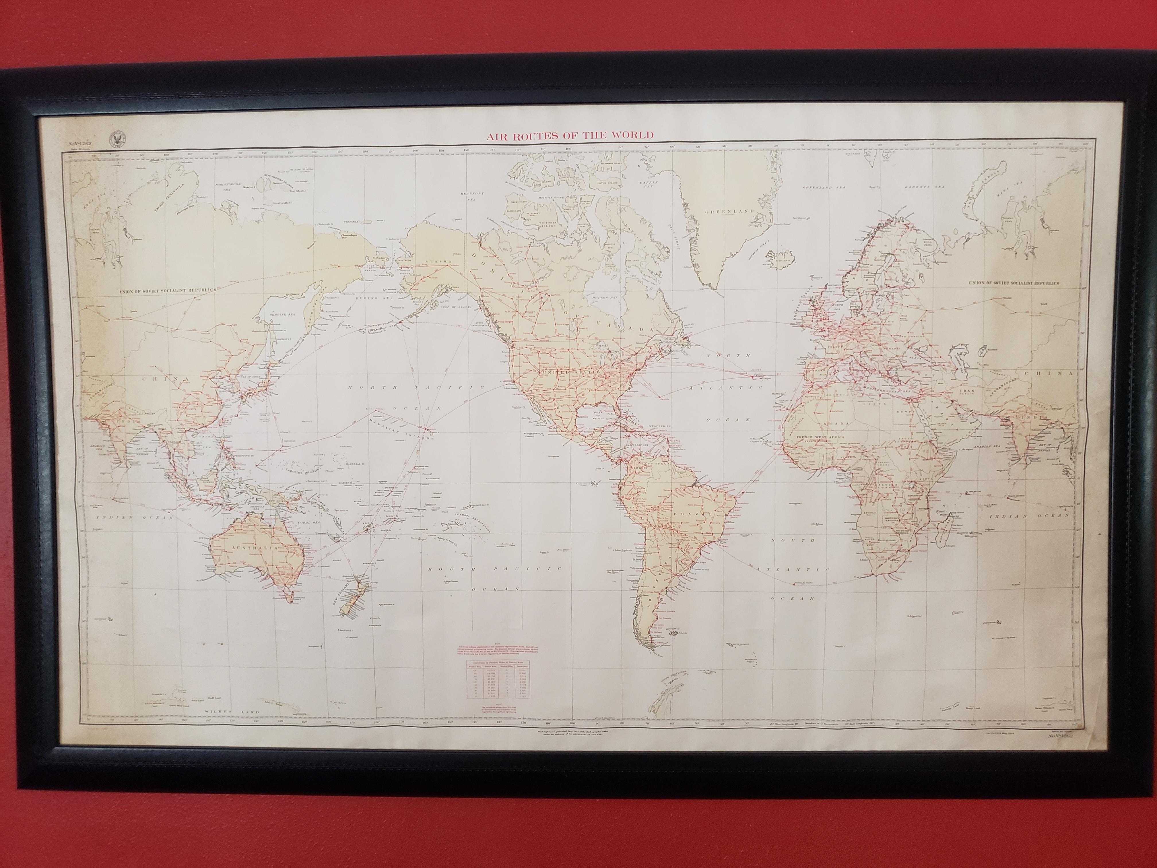 Map Info & Chart : 1939 Air routes of the world 50″ x 30″ bought at an estate sale. Rolled up for $8. Any information would be appreciated.