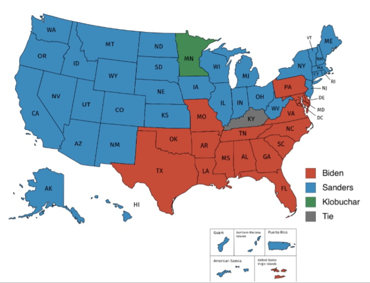 Map : 2020 Democratic primary map according to the FiveThirtyEight primary forecast model immediately following the South Carolina Caucus (2/29/20, 10:50pm EST)
