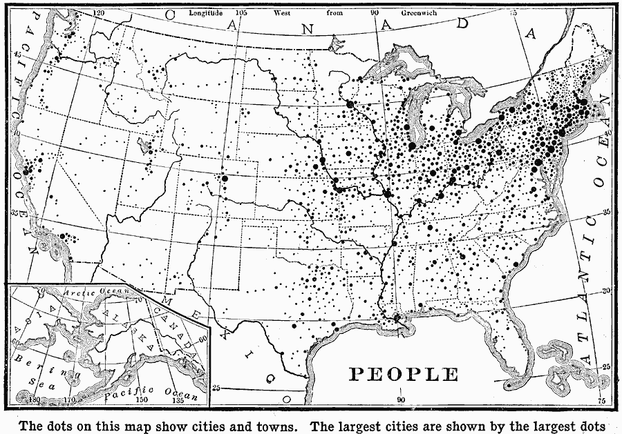 A cartogram (map) of the largest cities in the US in 1906 [900 x 629].