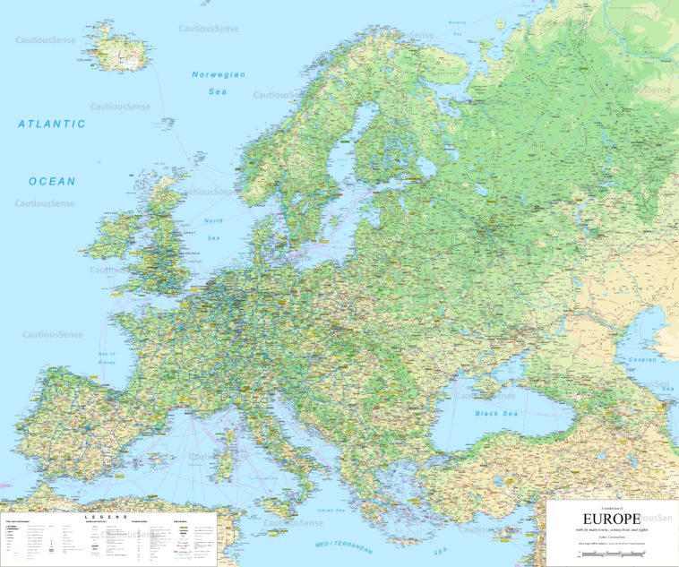 Map Info & Chart : A detailed map of Europe, with its main towns, roads, sights and much more [8706×7266]