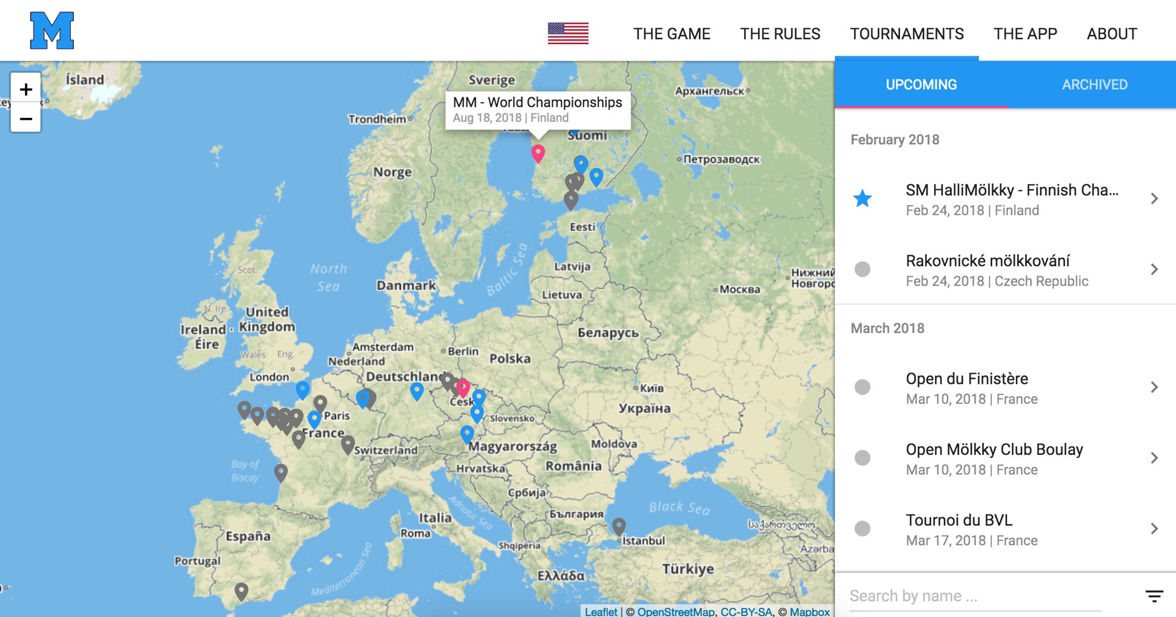 A map listing nearly 250 Mölkky tournaments (mostly in Europe)