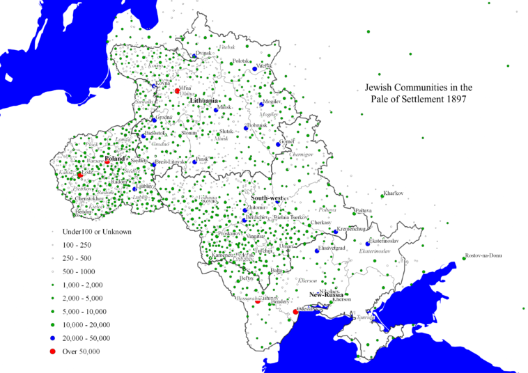 A map of the Jewish communities in the Pale of Settlement in the Russian Empire by their total size (total population) [3,507 x 2,480].