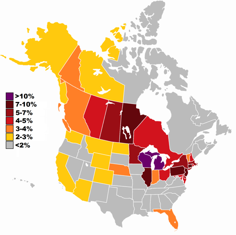 A map of the Polish-American and Polish-Canadian percentage out of the total population in various US states and Canadian provinces [1,749 x 1,740].