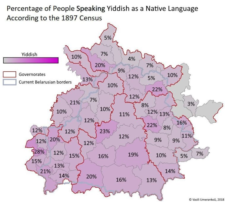 A map of the Yiddish language in what is now Belarus back in 1897 [992 x 892].