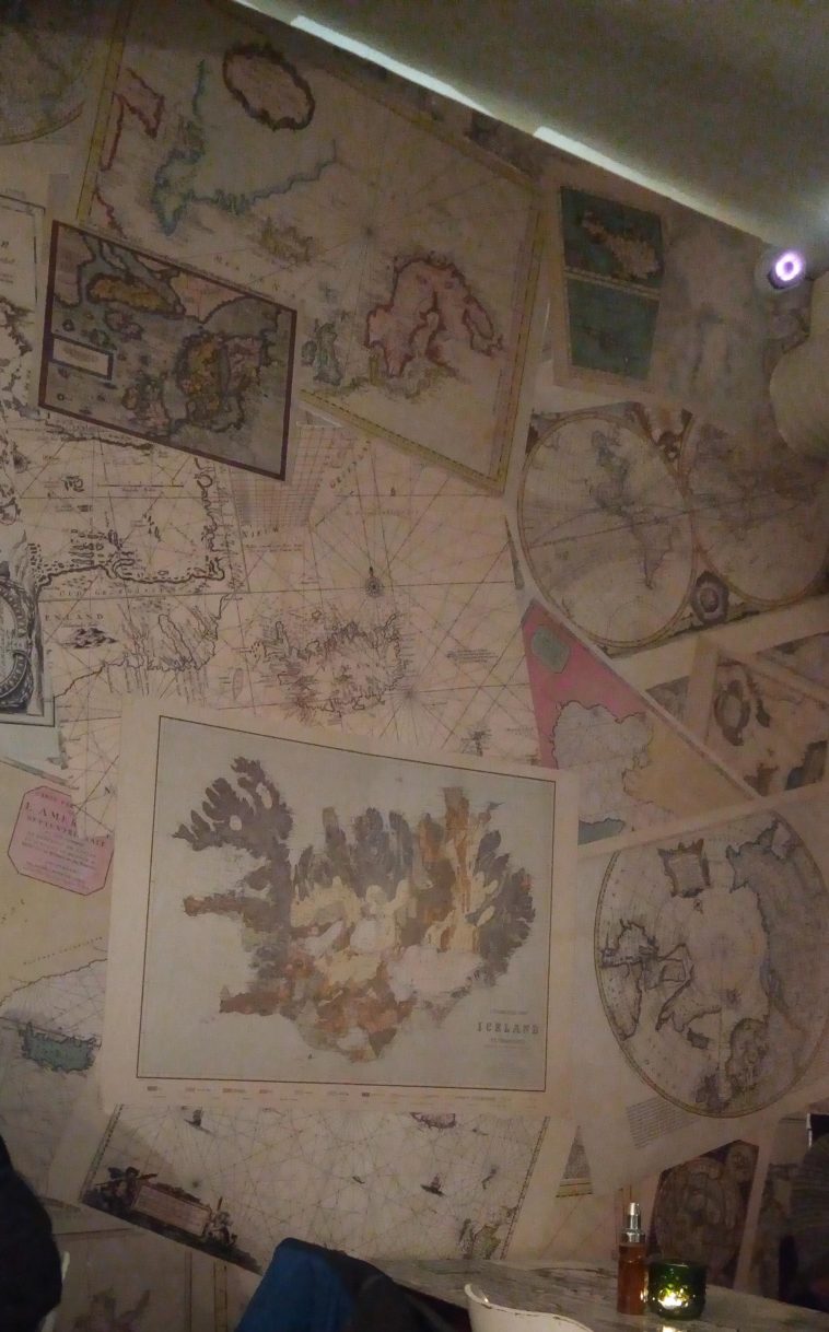 Map Info & Chart : A wall made with map of Iceland, in a Iceland restaurant.