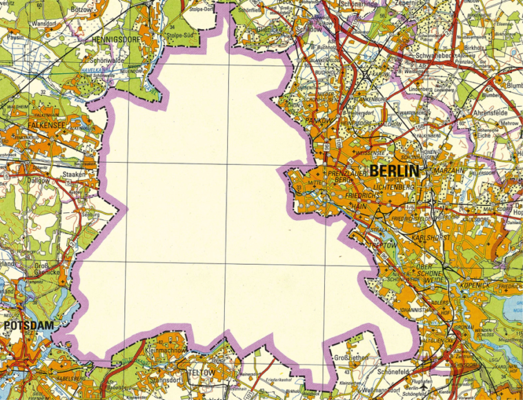 An East German map dating from 1988 that shows West Berlin as a gaping hole.