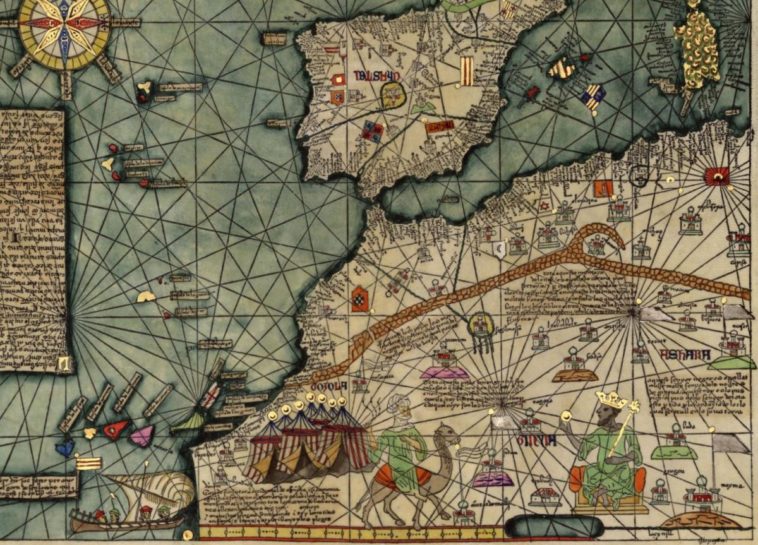 Map Info & Chart : Catalan Atlas, 1375 (Iberian Peninsula and NW Africa). Shortly after the death of Ibn Battuta. Mansa Musa is shown sitting on a throne with gold accessories.