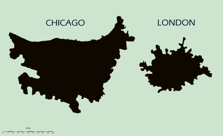 Map Info & Chart : Chicago continuous built up area compared to London continuos built up area.