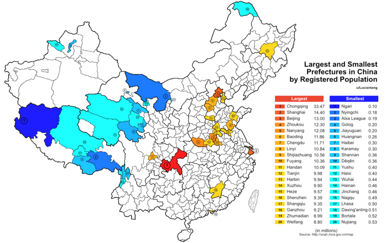 Map Info & Chart : China: largest and smallest prefectures by population [OC]