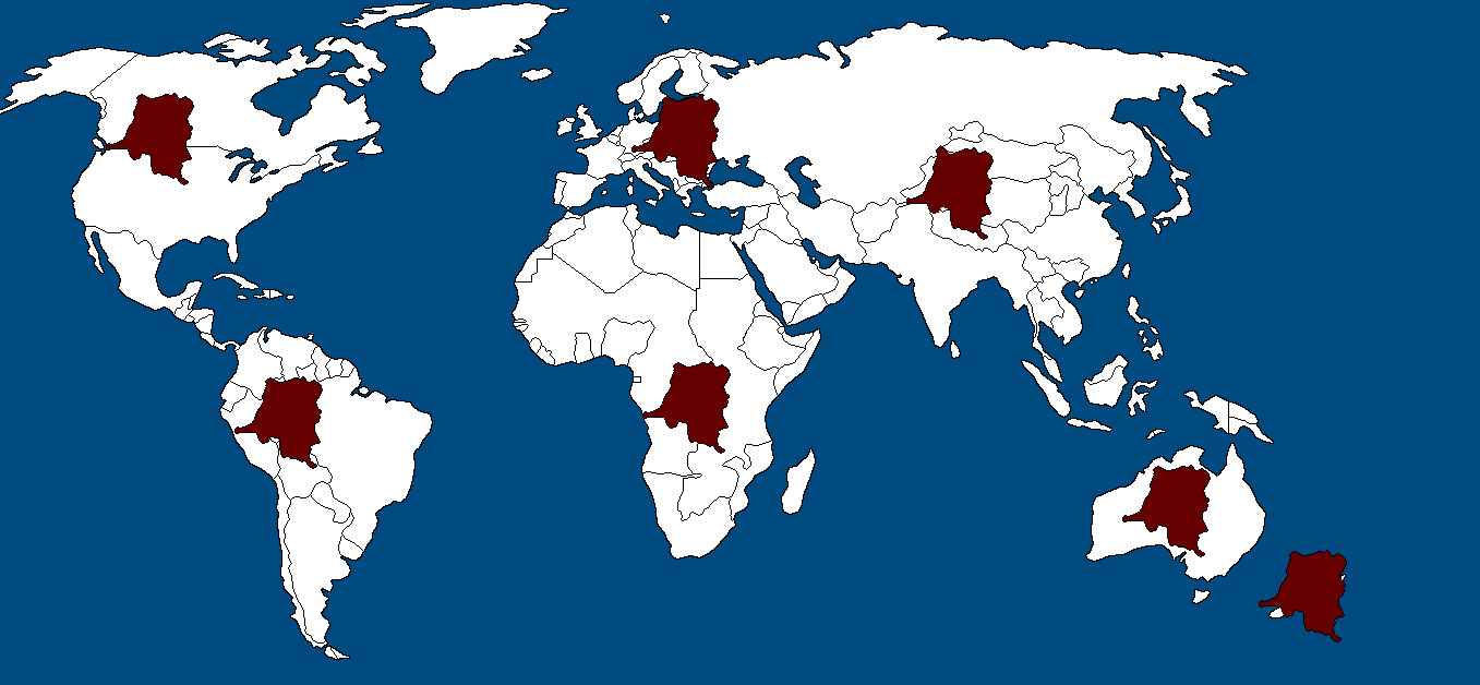 Map Info & Chart : Congo but on other continents (+ New Zealand, – Antarctica, WW2 map)