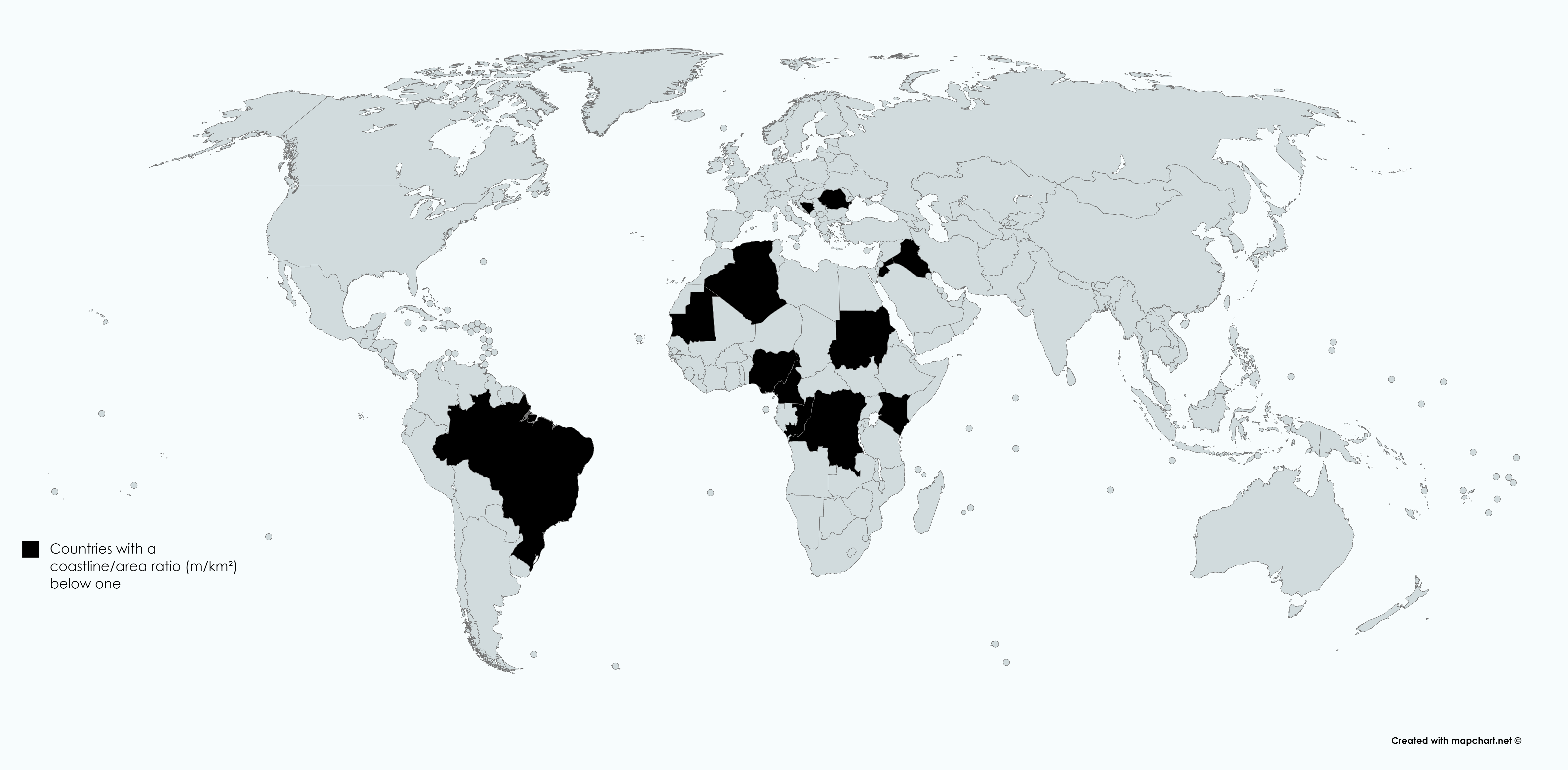 Map Info & Chart : Countries with a coastline/area ratio (m/km²) below one
