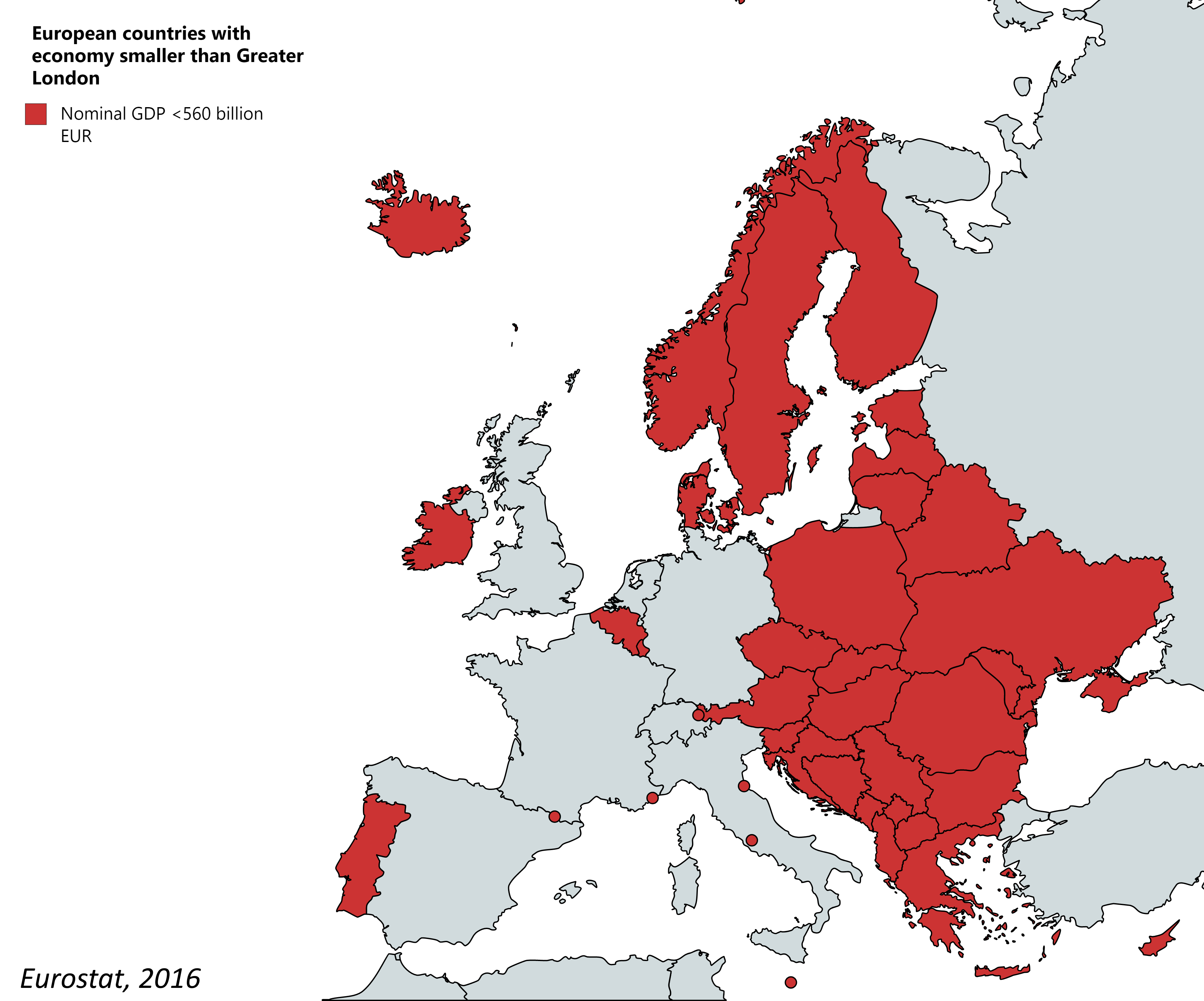 Map Info & Chart : European countries with economy smaller than Greater London [OC]