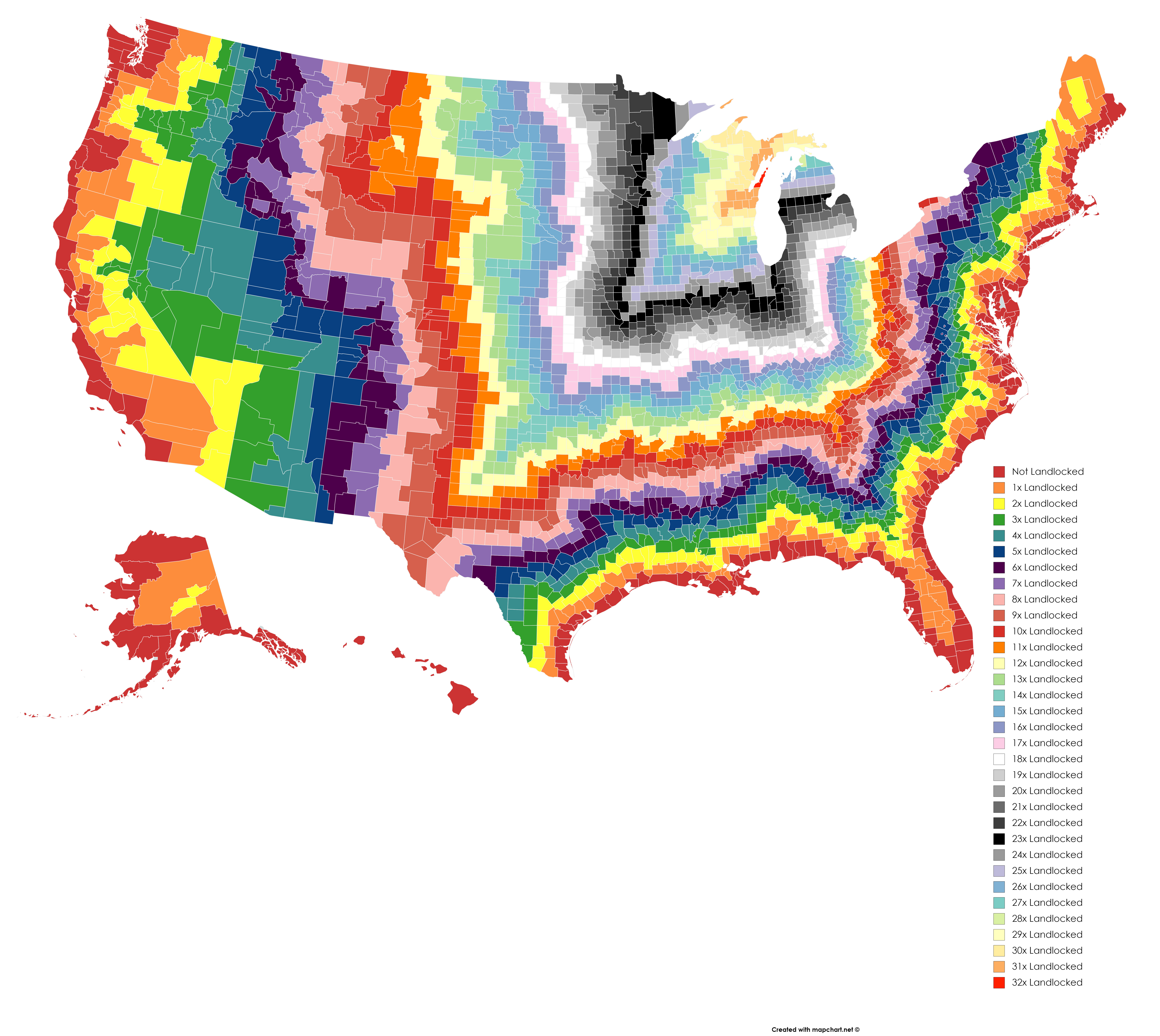 Map Info & Chart : How far each US county is from the ocean (within the US)