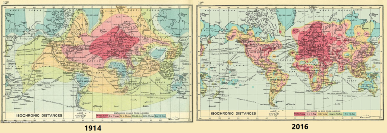 Map : How long it took to travel from London to the rest of the world: https://www.dailymail.co.uk/sciencetech/article-3385856/What-difference-century-makes-Maps-reveal-long-takes-travel-world-1914-2016.html