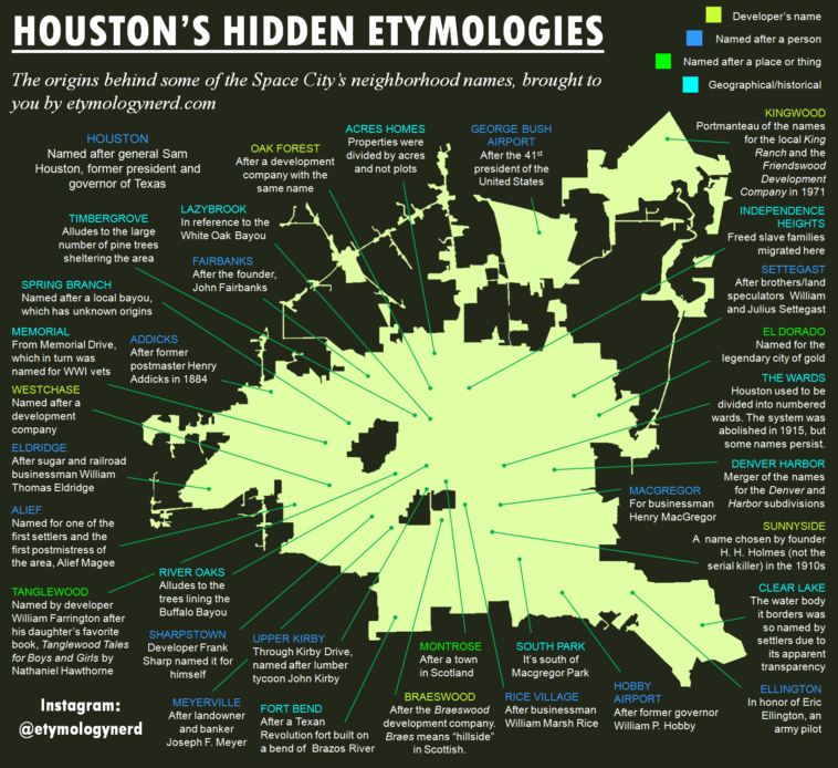 Map Info & Chart : I made this infographic explaining the origins behind some of Houston’s neighborhood names