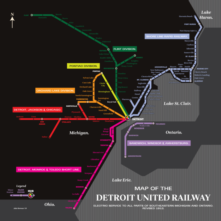 Map Info & Chart : In 1913, Detroit had a region-wide system of privately owned light rail 100 miles long and 80 miles wide. None of this remains. I drew a map of the system.