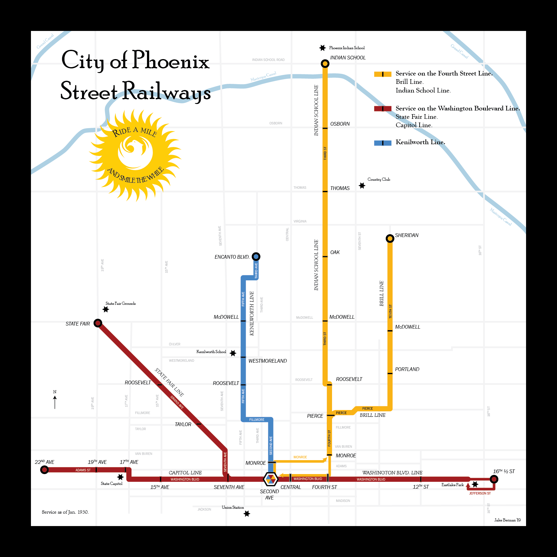 Map Info & Chart : In 1930, Phoenix was a small city of 48,000, but still maintained a municipal streetcar system of five lines. I drew a map of the system. Nothing of this remains today, except for two streetcars.