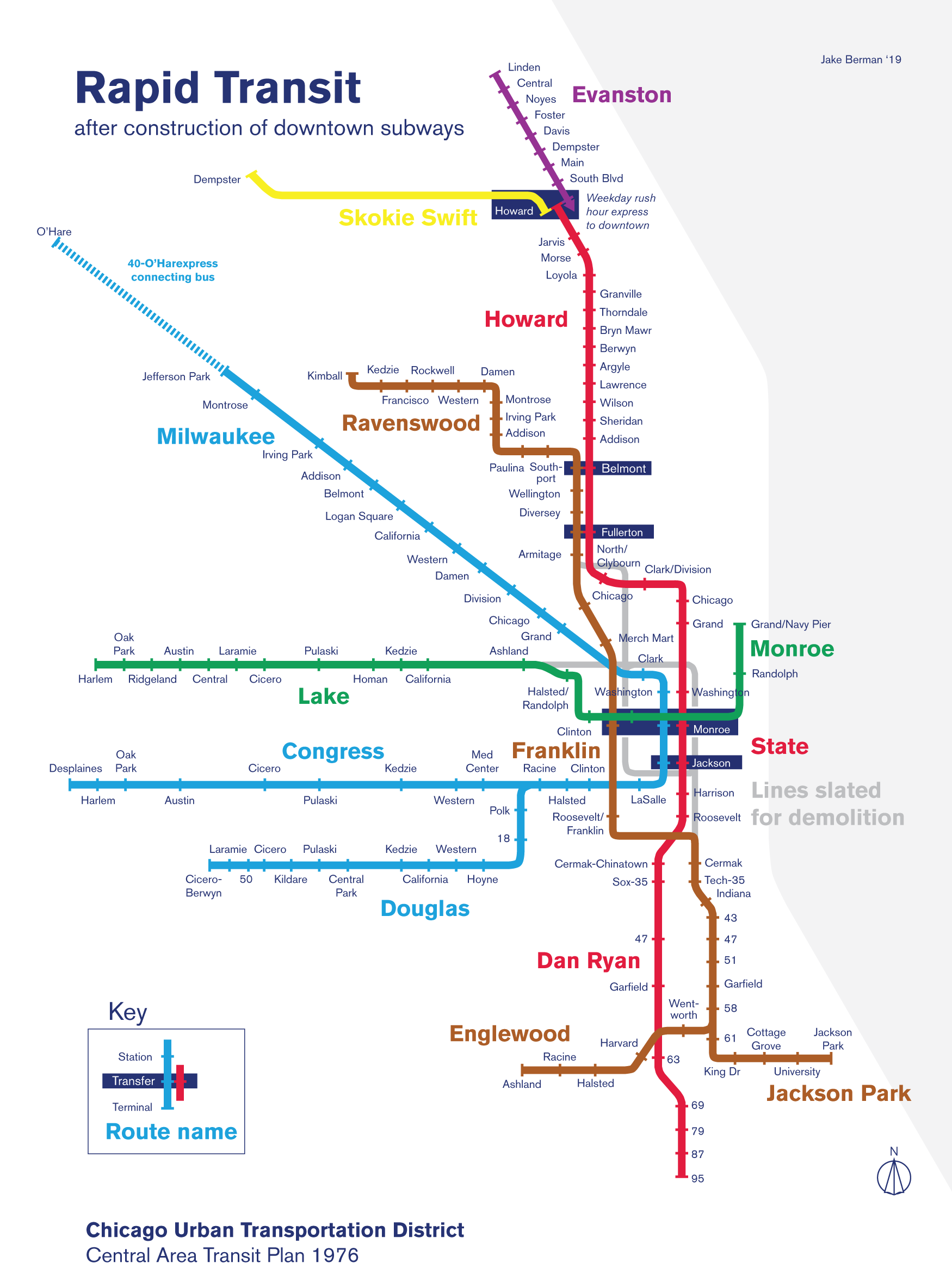 In 1976, Chicago planned to demolish the Loop, the iconic elevated railway structure that circles its downtown. I drew a map of the plan.