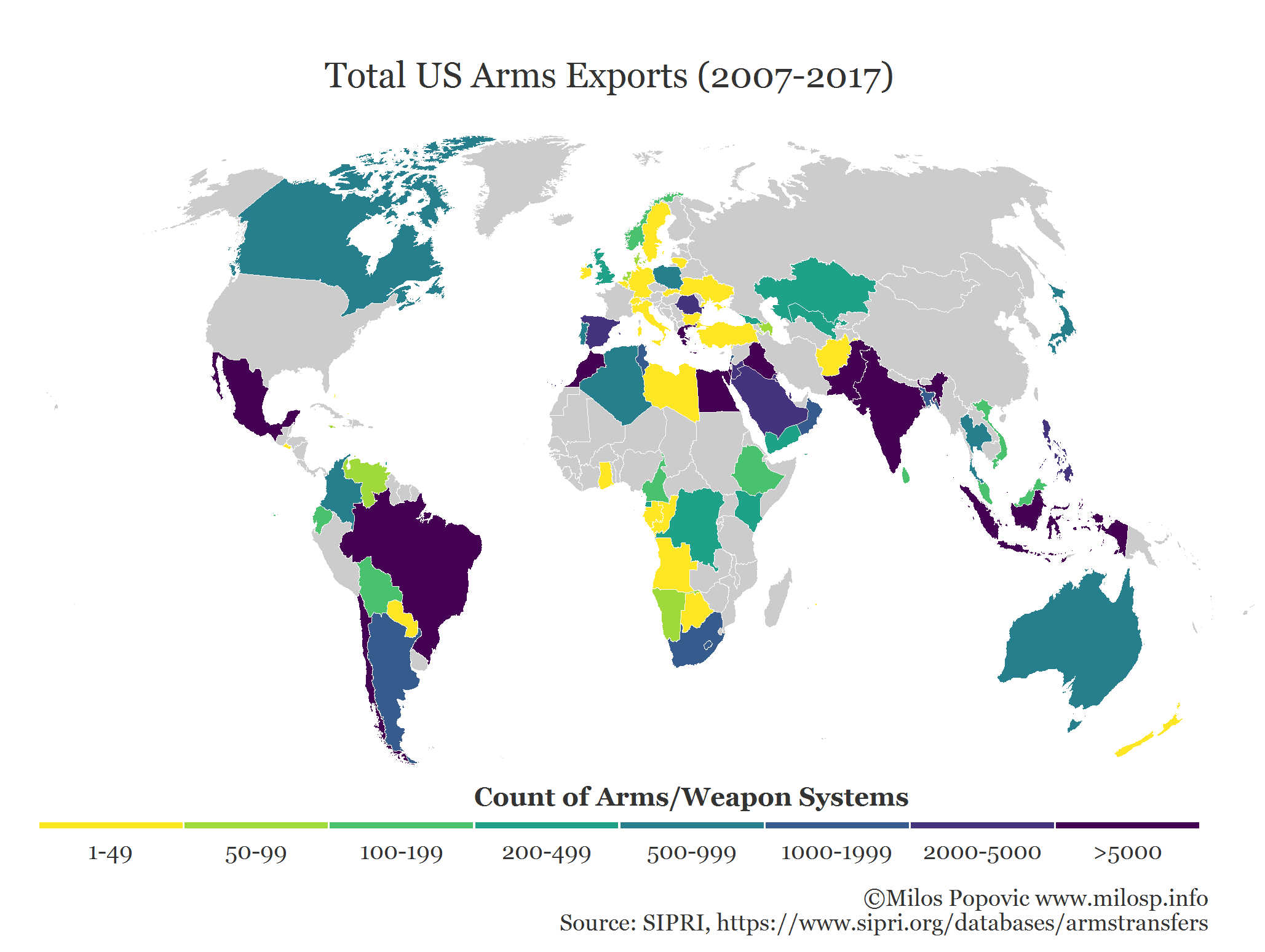 Major buyers of American weapons, 2007-2017 (see more maps @ www.milosp.info)[OC]