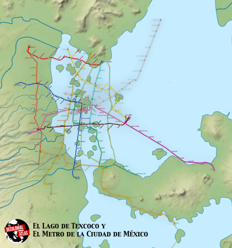 Map Info & Chart : Map of Mexico City’s subway overlayed on a map of Tenochtitlan/ Lake Texcoco. From The Decolonial Atlas.