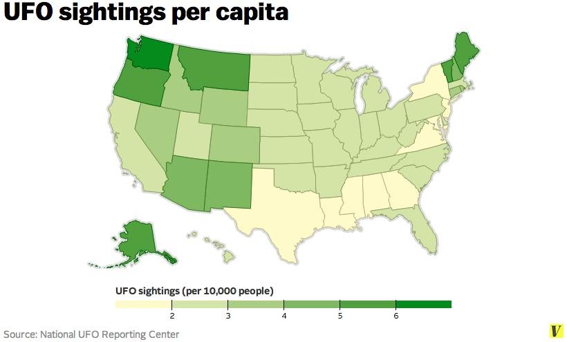 Map Info & Chart : Map of UFO sightings per capita in the US.