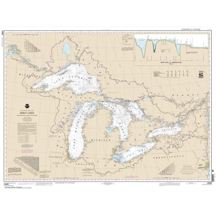 Map Info & Chart : Map showing the Great Lakes’ watershed, depth, etc