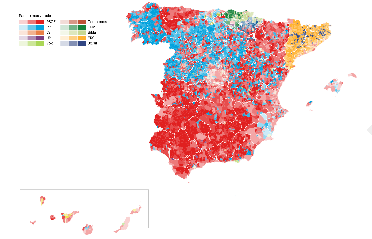 Most voted party in the Spanish General Elections (28/04/2019) by municipality [1438×923]