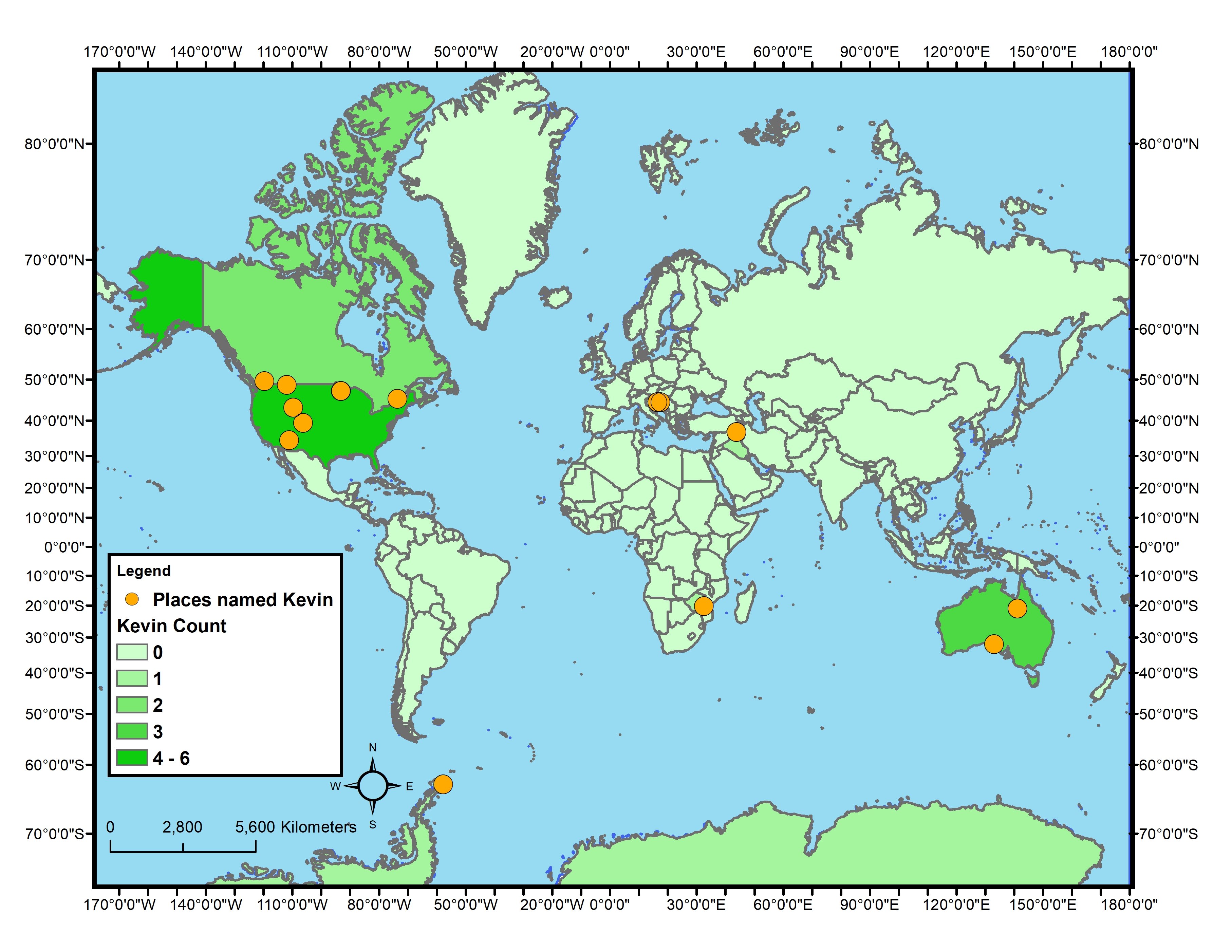 Map Info & Chart : My fiance’s family decided we were going to do personalized homemade gifts this year. I decided to map the locations of places “named” after various family members. Here’s Kevin’s. source: www.geonames.org