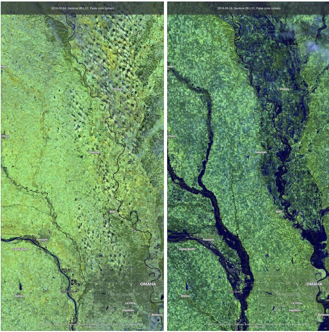 Nebraska flooding from satellite images (courtesy Copernicus EU)