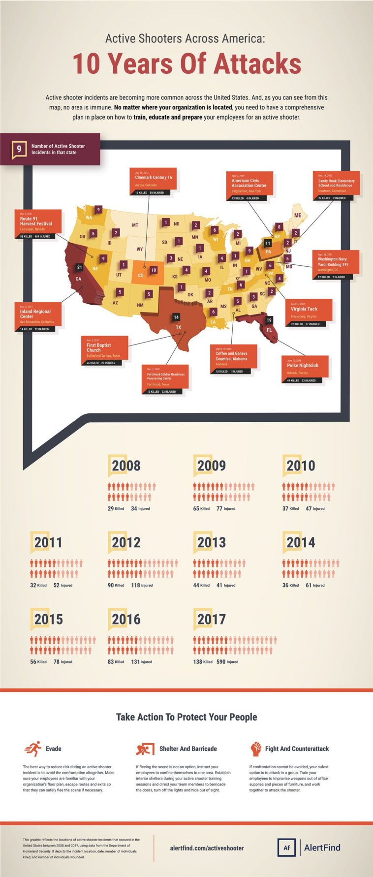 Map Info & Chart : Number of mass shootings by state over the past 10 years [1200×2821]