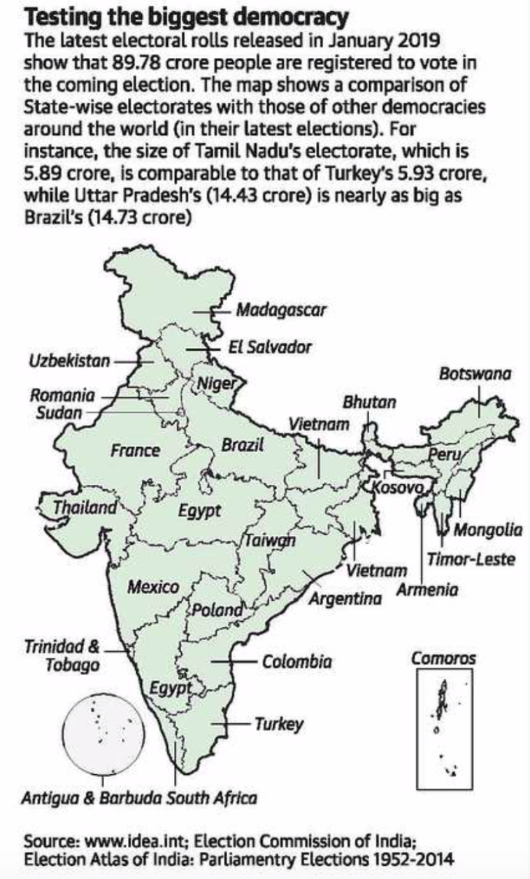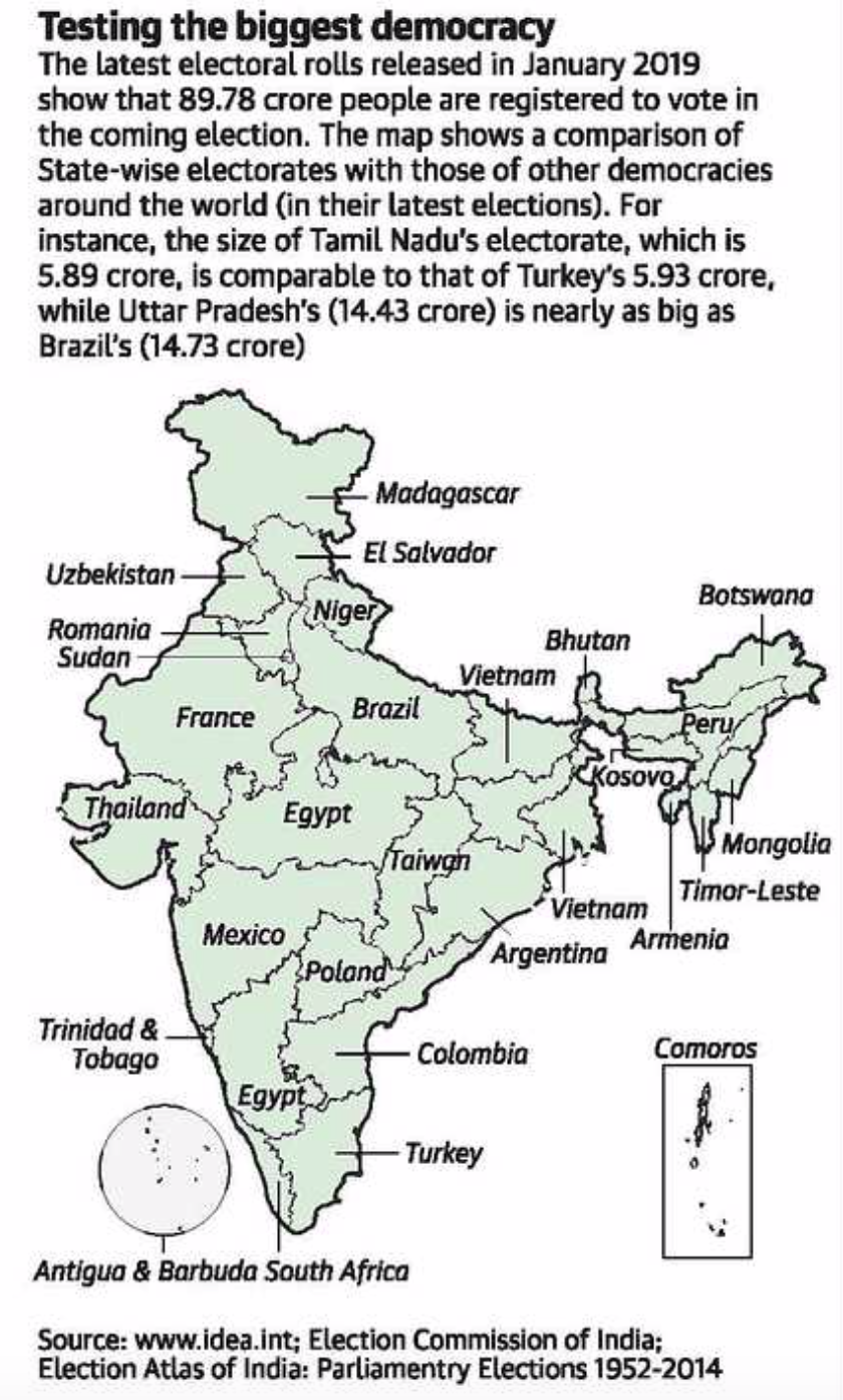 Map Info & Chart : Number of people voting in 2019 General elections in India per states, as compared to other democracies.