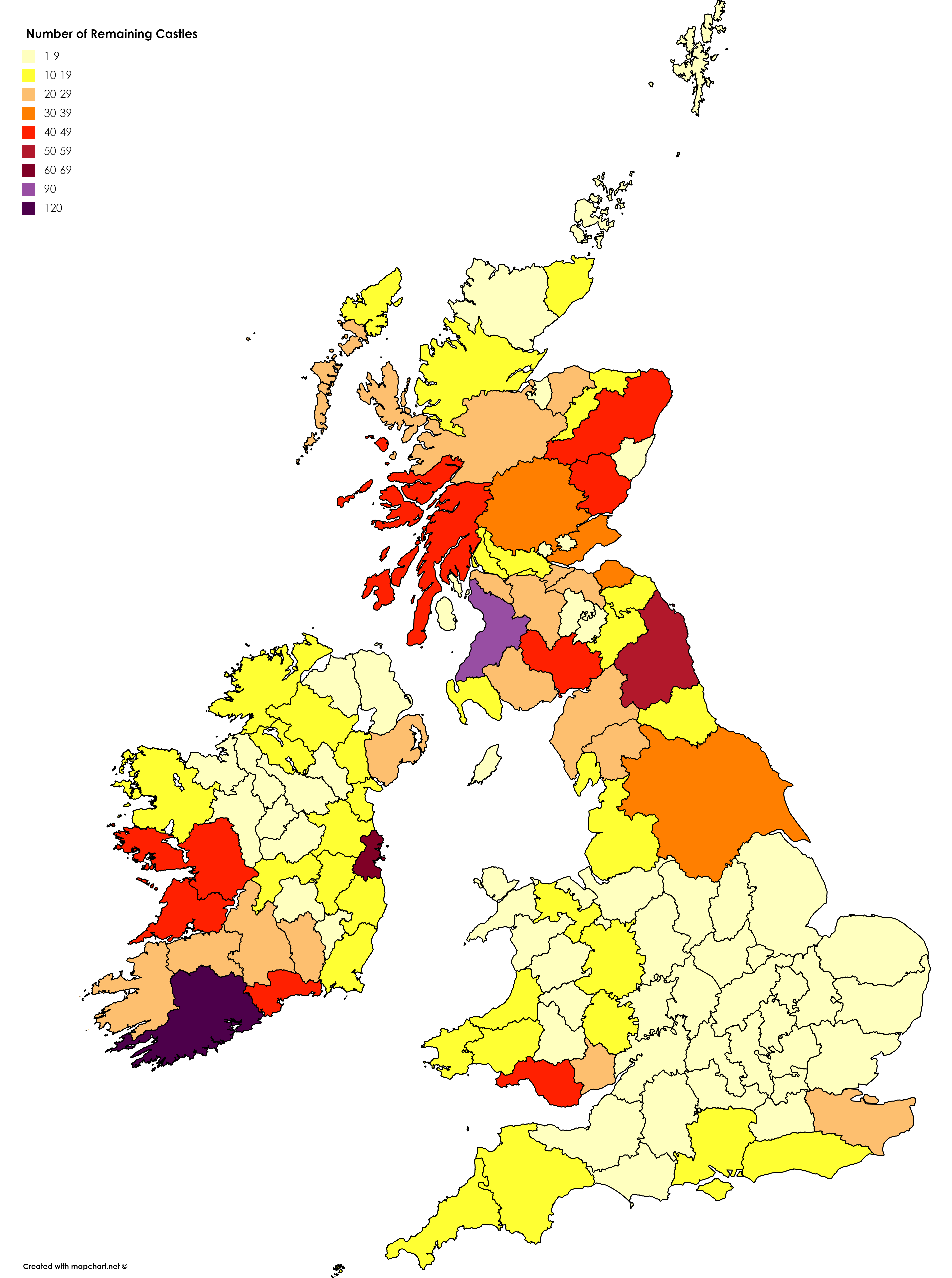 Map Info & Chart : Number of Remaining Castles in UK & Ireland