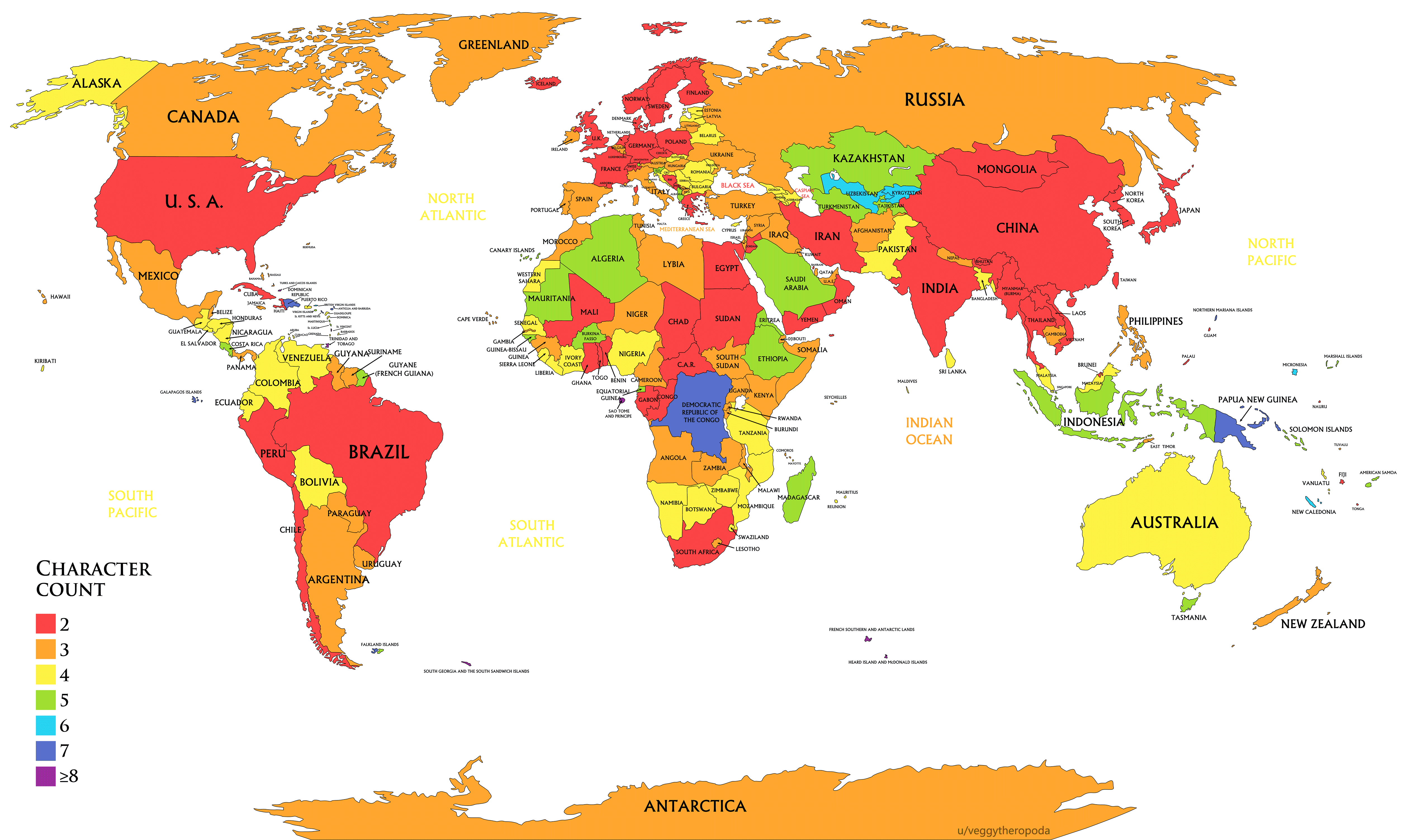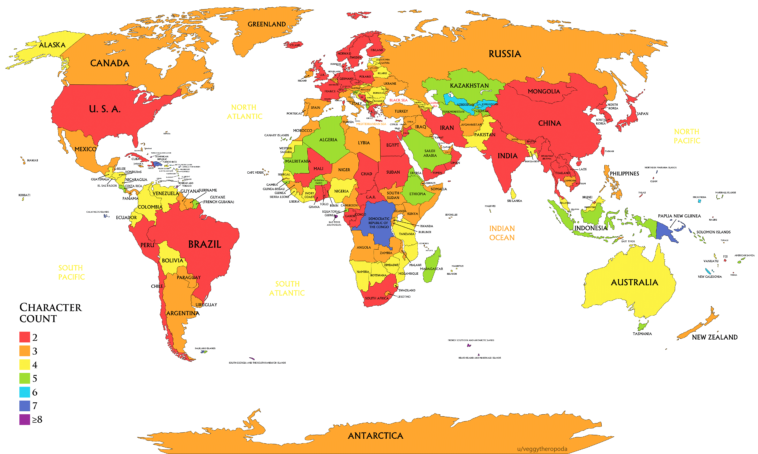 Map Info & Chart : [OC] Number of Chinese characters in each country’s Chinese name