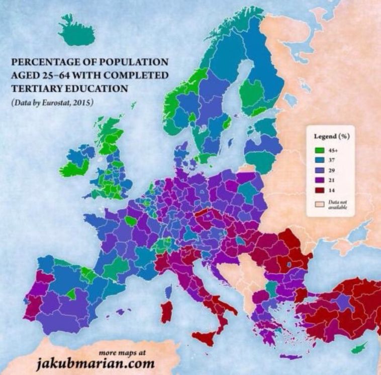 Map Info & Chart : Percentage of European Population with Tertiary Certification.