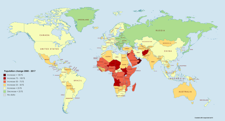 Map Info & Chart : Population change of world countries 2000 – 2017 [OC] [2000 x 1500]