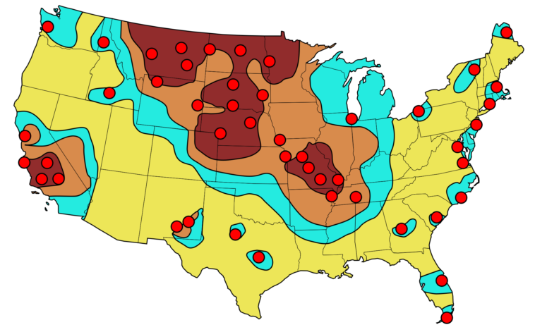 Primary target locations in the USA for Soviet nuclear strikes during 1980s. The resulting fall-out is indicated with the darkest considered as “lethal” to relatively fall-out free yellow zones.