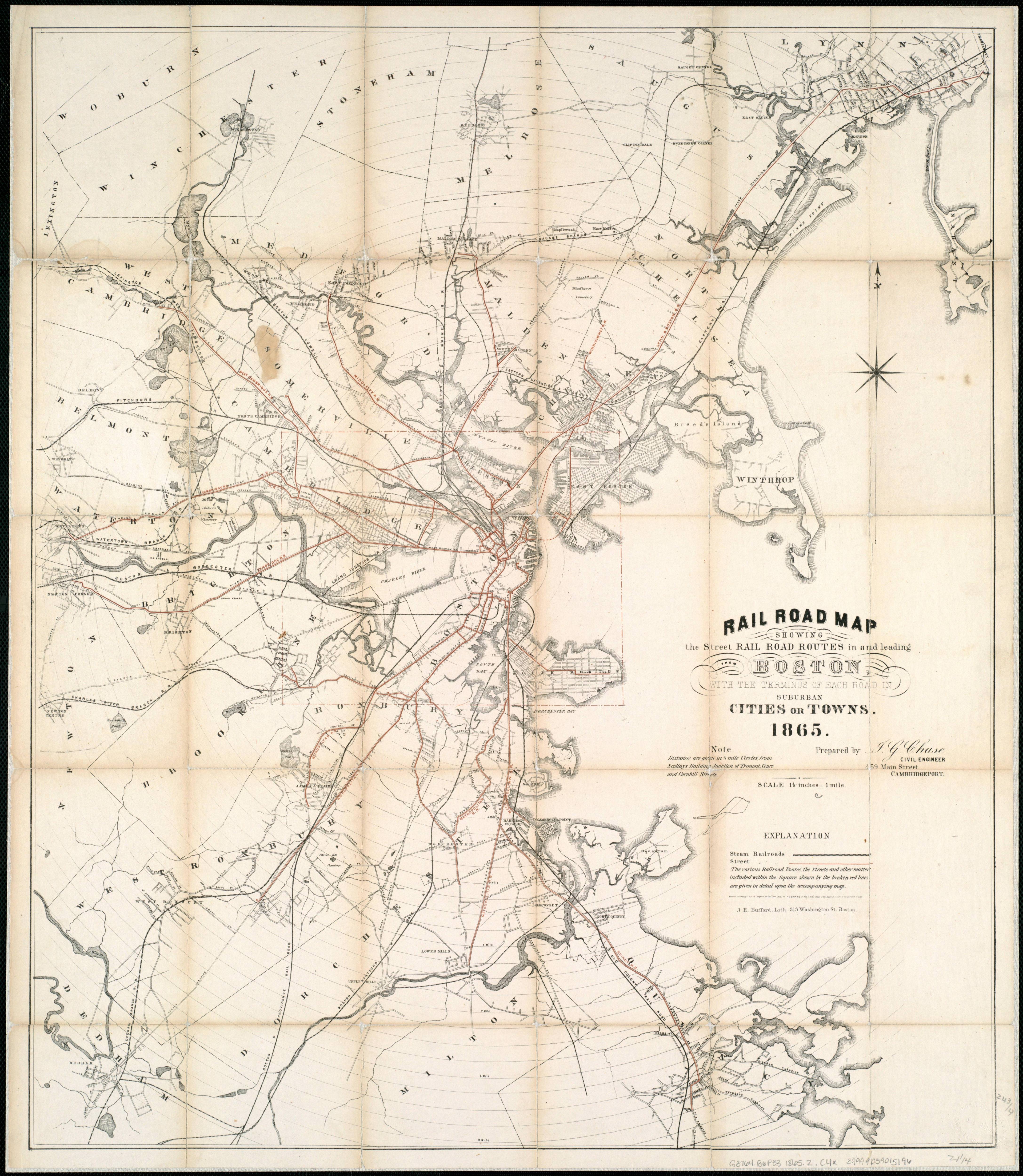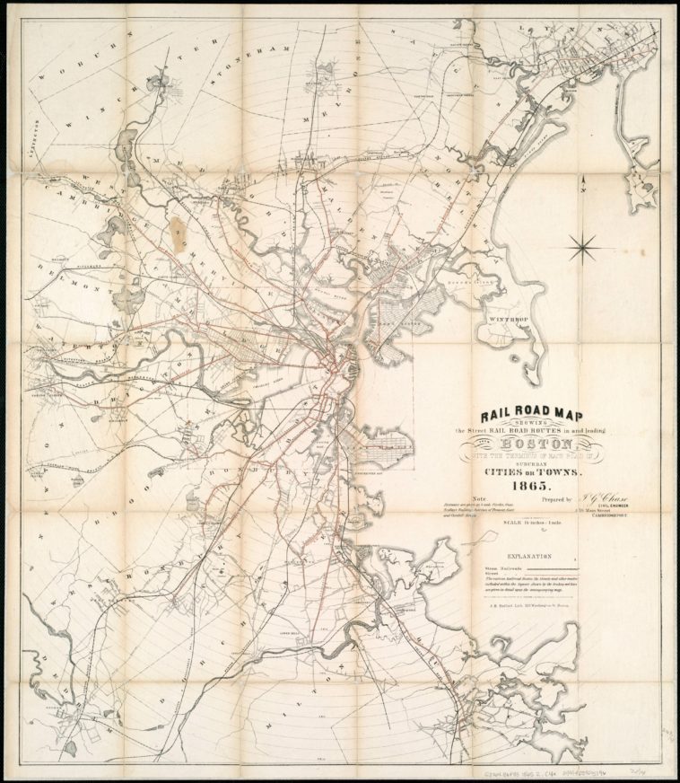 Rail Road Map showing the street rail road routes in and leading from Boston, with the terminus of each road in suburban cities or towns, 1865. [4348×5000]