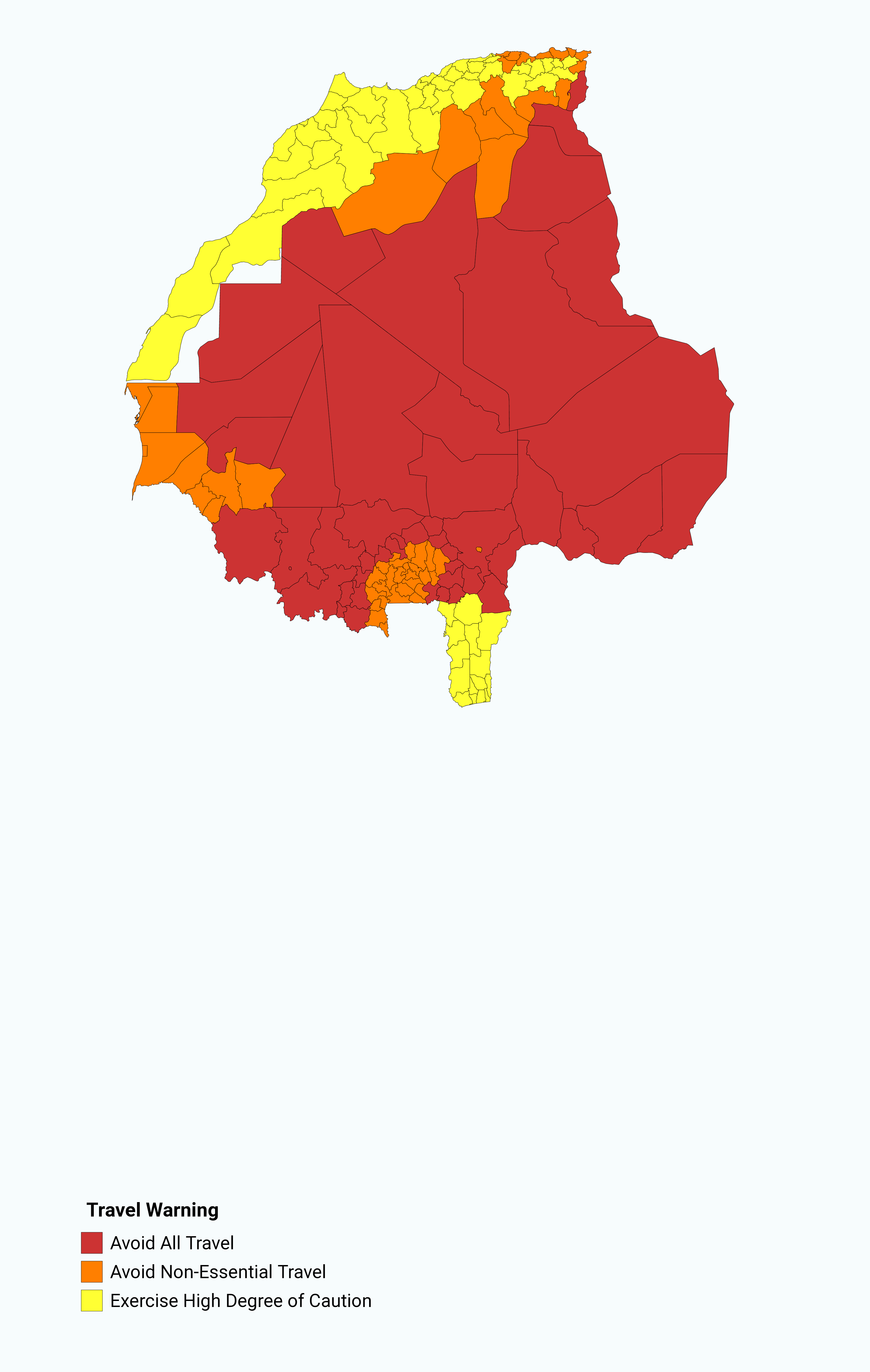 Regional map of west africa according to travel alert danger levels