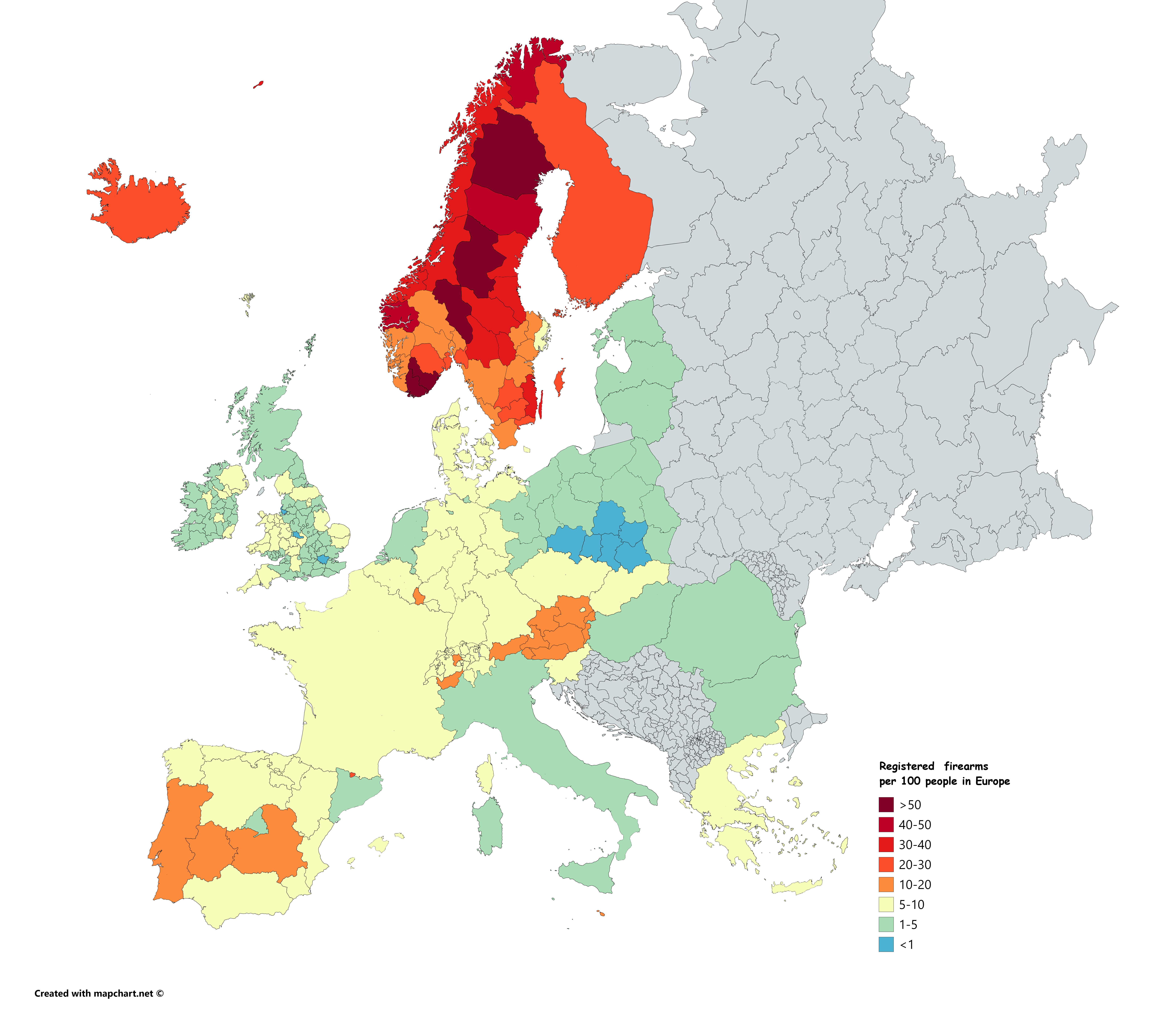 Map Info & Chart : Registered fiearms per 100 people in Europe