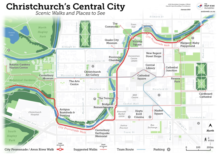 Map Info & Chart : Scenic Walks and Places to see in Christchurch’s Central City, New Zealand