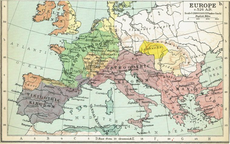 Second of four: Change in Europe, 5th & 6th centuries A.D. Europe c. 526. Muir, Ramsay, and George Philip. Philips’ Historical Atlas: Mediæval and Modern. 6th ed., George Philip & Son, Ltd., 1927.