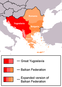 The Balkan federation was a left wing political project of the late 19th century. Its main idea was the creation of a socialist Republic consisting of Yugoslavia, Albania, Bulgaria, Romania and Greece. (Source: Wikipedia)