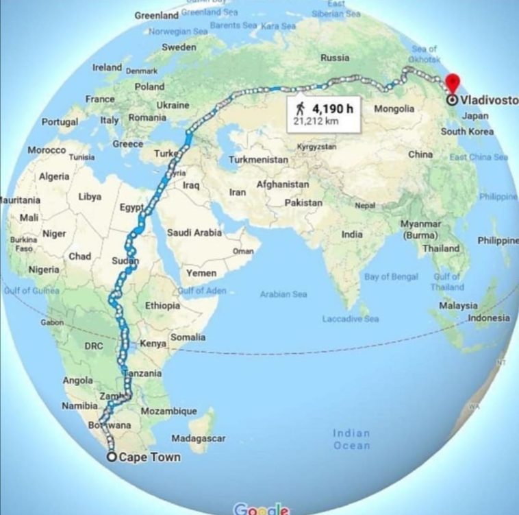 Map : The longest possible connected route to walk on earth, according to Google maps.