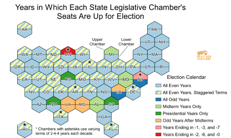 Map Info & Chart : Timing of U.S. state legislative elections for each chamber [3507 x 2098] [OC]